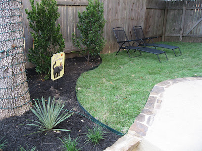 (Francie, I listened to your request!) Our yard makeover is complete. Here we have a freshly fluffed bed, with some kind of fern plants and Dianaella plants added. The black mulch makes everything look clean and crisp as well.