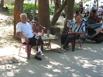 This particular pair of gentlemen (below) seemed to epitomize the essence of the day, so in a bold move, I snapped a picture clearly aimed right toward them, and at that very moment, the white-haired one on the left gestured for us to come join them. He pointed to the spare plastic chair and insulated chrome container of hot tea on the table to welcome the two of us. His kindness and spontaneus invitation absolutely charmed me, and I greatly appreciated his geniune hospitality, even though I could not express myself adequately in Chinese to him, as I graciously declined their offer. With a little body language and a simple "xie xie ni," I made my point, then Jennifer also thanked him more in depth, then we continued on our walk.